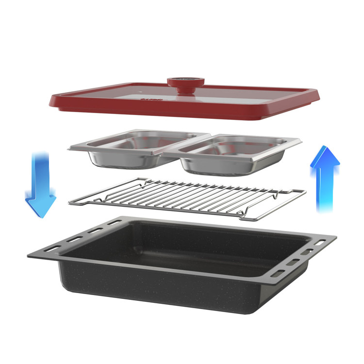 حجم ۷۲ لیتری این فر، امکان پخت و پز غذاهای متنوع و در ابعاد بزرگ را فراهم میکند. با دو عدد سینی کمعمق و عمیق، میتوانید انواع غذاها، شیرینیها و کیکها را با کیفیت عالی آماده کنید. همچنین طراحی ۴ ریل تلسکوپی، حرکت آسان و بیدردسر سینیها را فراهم کرده و دسترسی به داخل فر را سادهتر میکند.